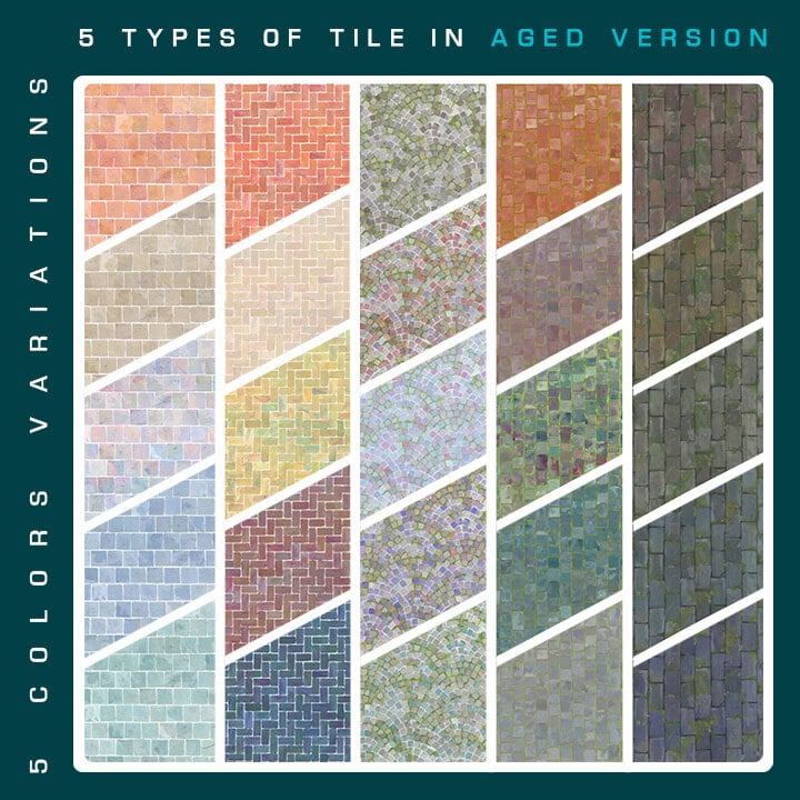 You'll find 10 original designs made up of 5 types of tile, each ones in 2 versions, one clean and one aged with weeds and/or numerous cracks and patina surface. Each original design is proposed in 5 color variations. Of course the textures are perfectly tileable!