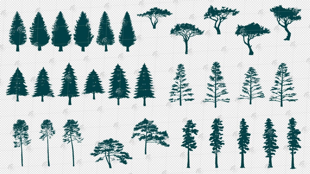 The silhouettes are the perfect basis to create very easily and quickly a graceful vegetal setting or stylish forest. You can see an example of a speed artwork made with a selection of these conifers.